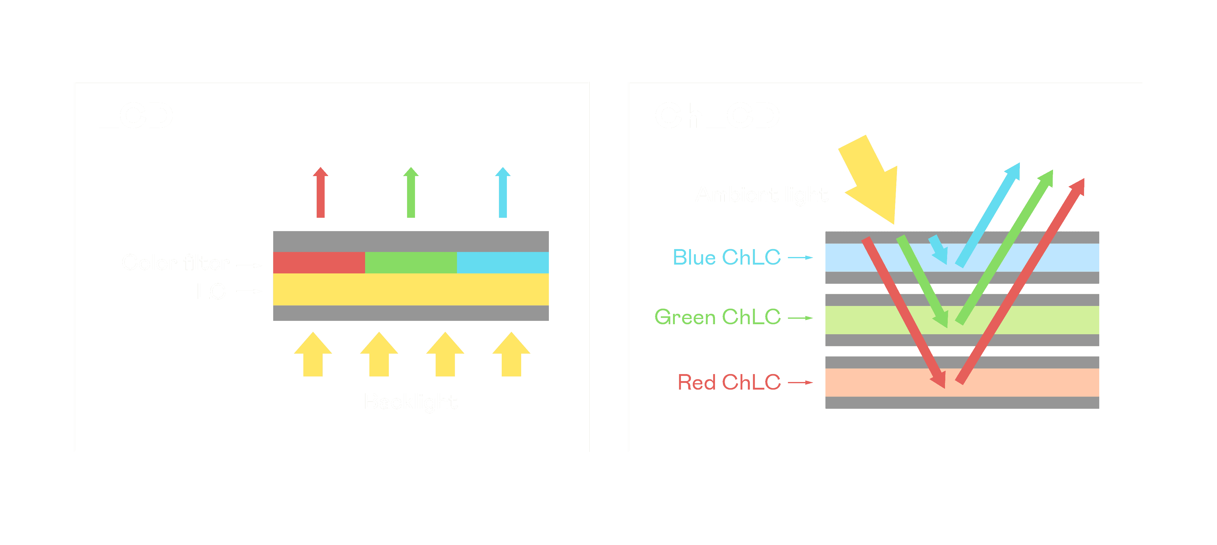 ChLCD 胆固醇液晶就如同纸张一样,,,,透过反射环境光来显示影像,,,,因此长时间观看不易造成人眼视觉疲劳,,,可达到护眼效果。。。。当处于户外阳光下使用,,,,LCD 影像容易失真而不易观看,,,但胆固醇液晶仍可维持较佳的影像品质。。。