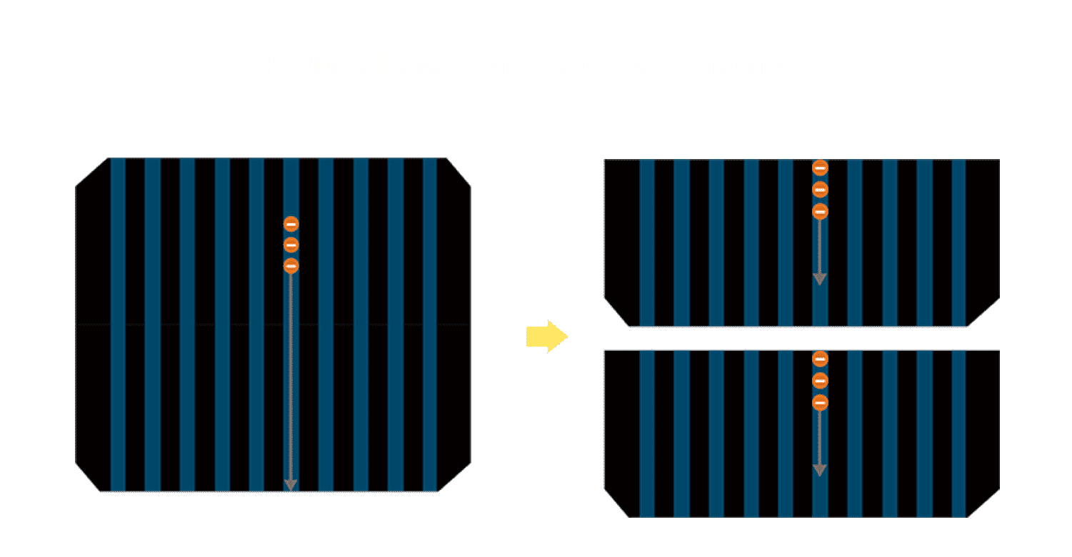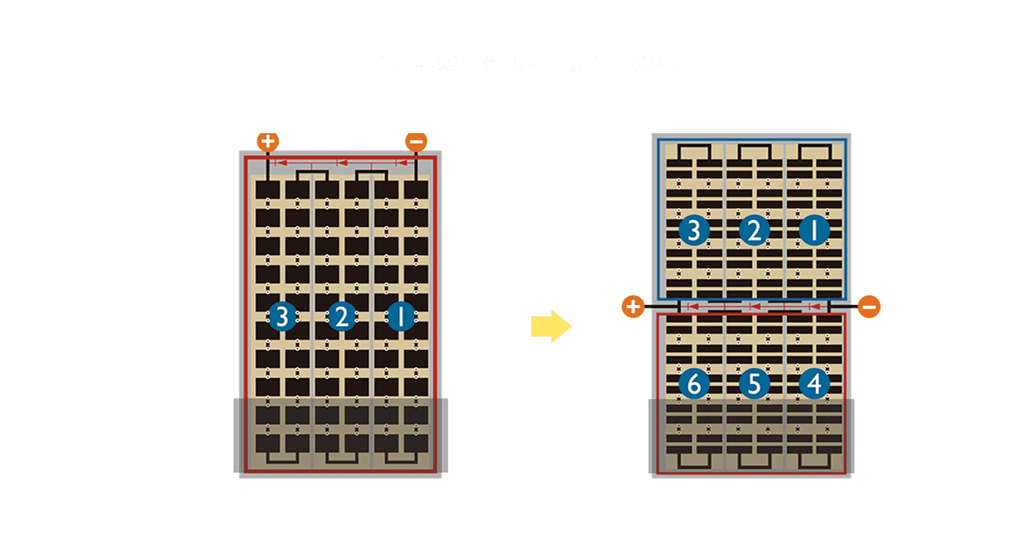 - 结合半切电池,,,降低遮阴影响、、、提升模组抗隐裂能力、、并减少电阻损耗,,,,进一步提升模组发电效能。。。
